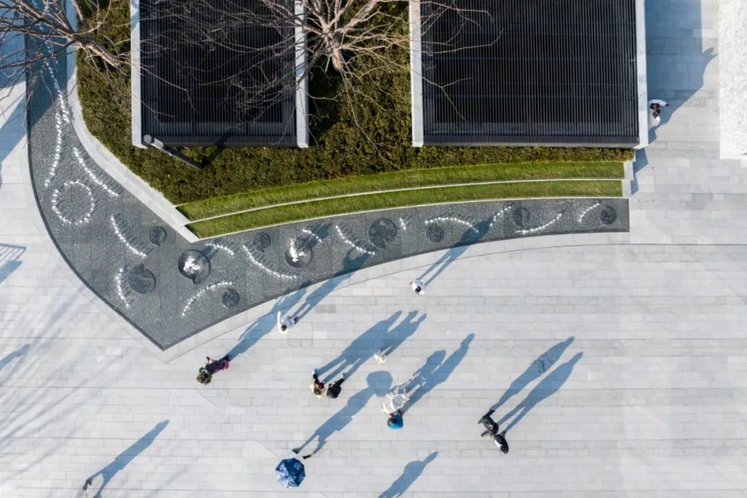 景觀內(nèi)容的選擇上,三面云山的樹陣表達(dá),圓形廣場(chǎng)的西湖水,以及在邊界處長(zhǎng)紋綠整石構(gòu)建的連續(xù)臺(tái)地,荷葉連連水景以及散落櫸樹下的藝術(shù)坐石,整體上去實(shí)現(xiàn)小場(chǎng)景-大氣象,小細(xì)節(jié)-大文化,小空間-大杭州。
